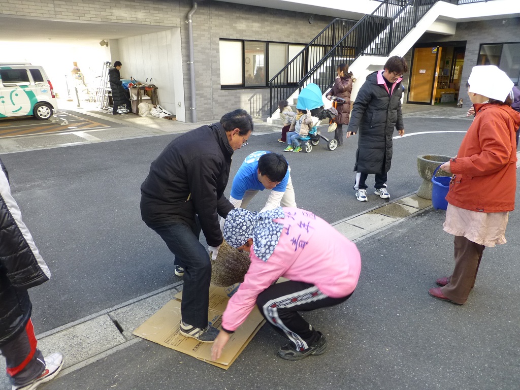 石臼を中央に運びだし、まずは餅つきの準備です