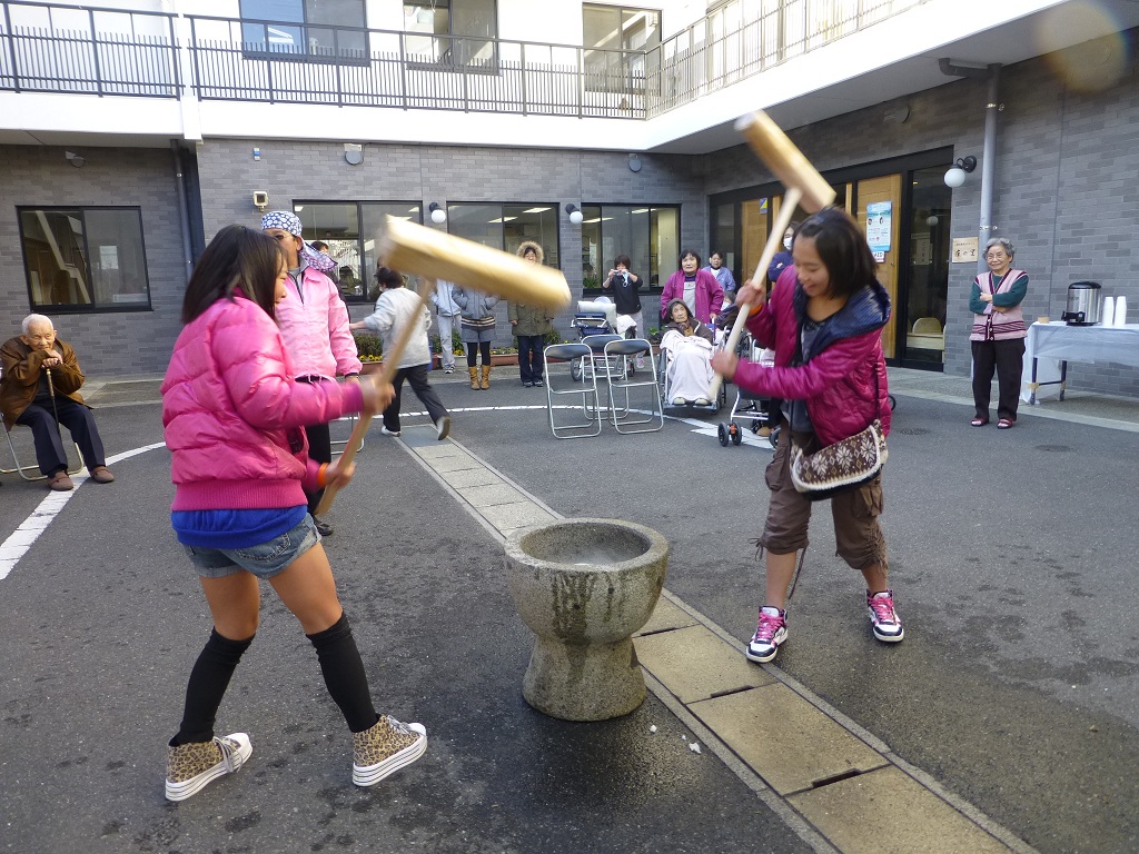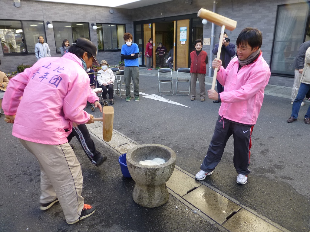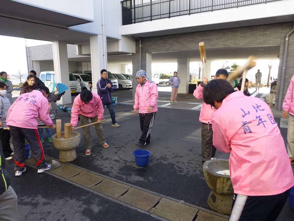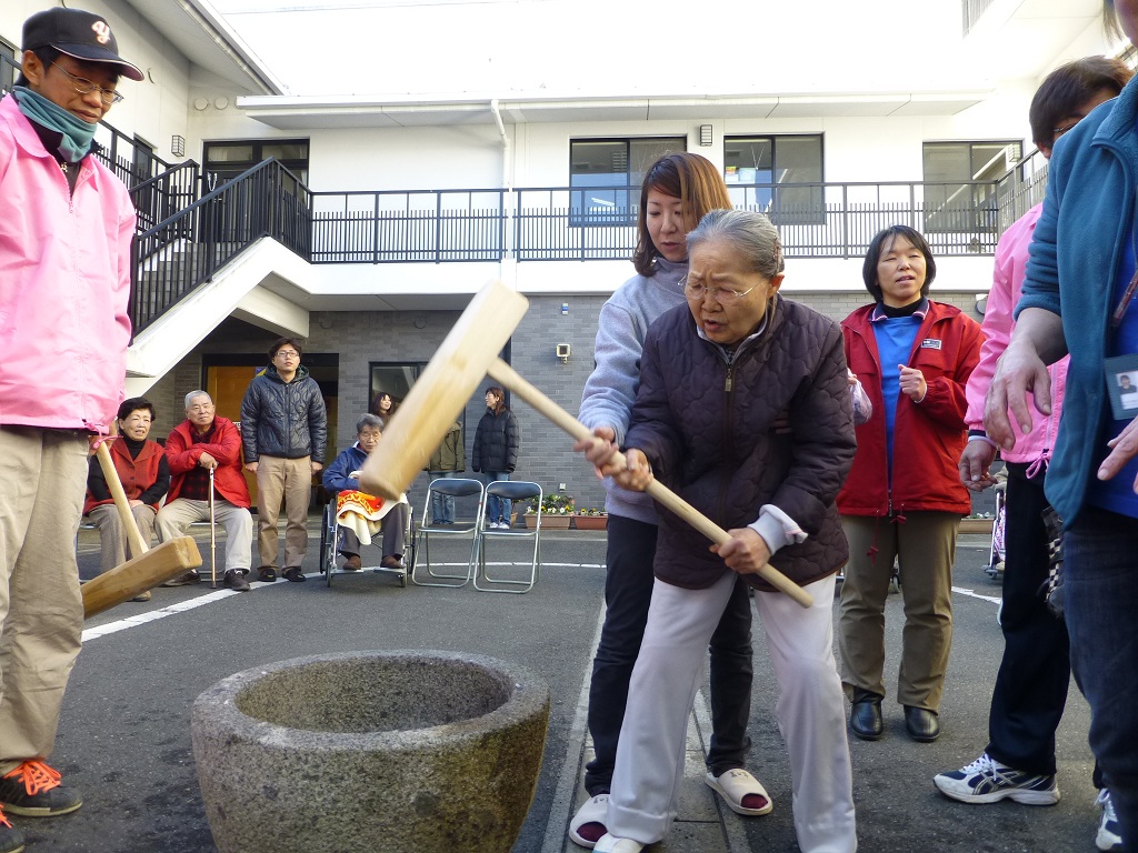 )毎年この時期、山地の特別養護老人ホーム「庄の里」では餅つきを行っています
